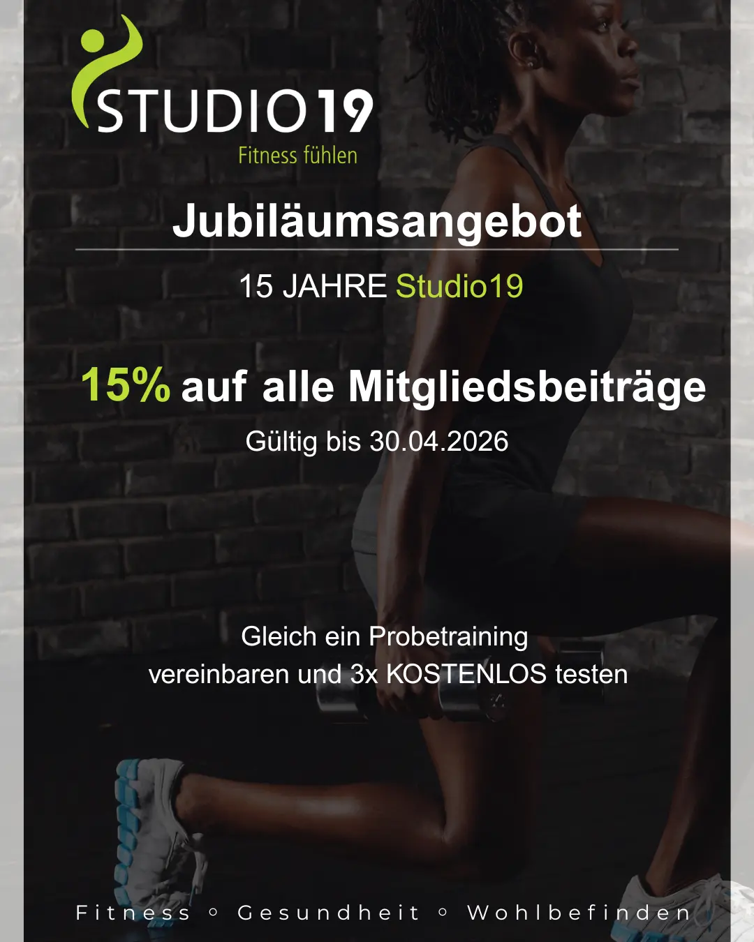 Studio 19 ist nicht nur ein Fitnessstudio. Wir gehen auf jeden Kunden persönlich ein: mit Kompetenz, Ehrlichkeit und ganz viel Herz. Mit unserem eigenen Trainings-Betreuungssystem begleiten wir Dich Schritt für Schritt über das ganze Jahr mit einem Ziel: Dein Erfolg und Wohlbefinden.